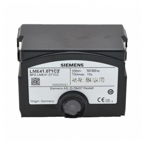 Топочный автомат Siemens LME41.071C2 предназначен для ввода в эксплуатацию и контроля 1 - и 2 - ступенчатых газовых горелок или газовых горелок в повторно-кратковременном режиме работы. Контроль пламени осуществляется с помощью ионизационного датчика пламени или датчика пламени QRA с дополнительным устройством AGQ3.1A27 для газовых наддувных горелок или при голубом пламени с помощью датчика голубого пламени QRC