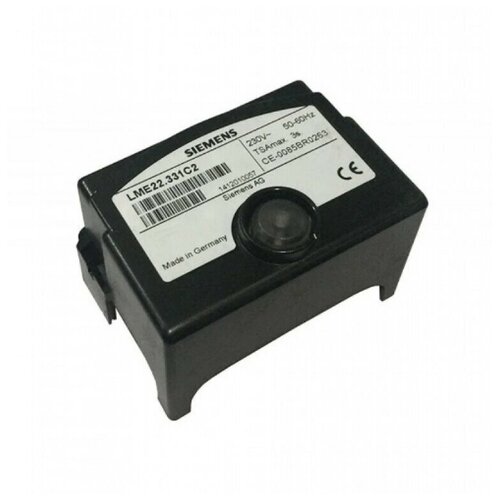 Блок управления горением Siemens LME22.331C2Блок управления горением Siemens LME22.331C2 предназначен для 1 - и 2-ступенчатых газовых горелок или газовых горелок в повторно-кратковременном режиме работы. Контроль пламени осуществляется с помощью ионизационного датчика пламени или датчика пламени QRA с дополнительным устройством AGQ3.XA27 для газовых наддувных горелок или при голубом пламени с помощью датчика голубого пламени QRC.Вольтаж: 230 V.Ожидание: 2.5 сек.Время предпродувки: 30 сек.Время безопасности: 3 сек.Ожидание зажигания: 2 сек.Ожидание до зажигания: 3 сек.Тайминги зажигания BV2 и выключения: 8 сек.Параметры и условия эксплуатации:Длительность продувки: 30 секунд.Предохранительное время: 3 сек.Время перед поджигом: 3 секунды.Требования к сети: 220 Вольт, 50/60 Гц.Мощность потребления электроэнергии: около 12 Вт.Рабочая среда: газ.Температурный режим: -20...+60ºC.Класс электрозащиты: IP 40.Конструкция:SIEMENS LME изготовлен по типу «встраиваемой корзины». В пластиковом корпусе, стойком к высоким температурам, находятся основные элементы: микроконтроллер, реле управления, электронный усилитель сигнала пламени.Предусмотрен сервопривод. Цоколь и датчик контроля пламени не включены в комплектацию.Кнопка аварийной остановки/запуска снабжена светодиодом и гнездом для подключения интерфейсного адаптера.Функционал и возможности:Блок автоматического управления при блокировке немедленно отключает выводы для топливных клапанов, двигатель горелки и систему зажигания (длительность срабатывания < 1 секунды).Прибор имеет защиту от низкого напряжения. При падании рабочих параметров до 175 Вольт аппарат автоматически выключается. Перезапуск инициируется при восстановлении рабочего напряжения (185 В).Контролирует горение пламени ионизационный электрод или датчик пламени QRA с доп. блоком AGQ3.Контроль давления воздуха происходит путем проверки работоспособности реле давления в ходе пуска и эксплуатации оборудования.Продумана система информирования о текущих событиях и причинах сбоев. Для оповещения о работе автоматики предусмотрена многоцветная индикация и система кодов. Также получить сервисную информацию можно через интерфейсный адаптер и специализированное ПО (ACS410 PC Windows software).SIEMENS LME имеет длительный срок службы – порядка 10 лет (250 тыс. рабочих циклов).Производитель: Siemens, Германия