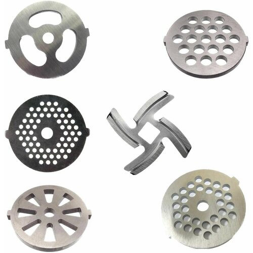 Комплект из 5-х решеток и ножа для мясорубки высокого качества, в комплект входят пять решеток и нож: 1. Средняя (универсальная решетка) - диск с отверстиями 4-5 мм, количество отверстий до 50. Самая распространенная сетка для мясорубки, входит в комплект любой мясорубки и предназначена для изготовления домашнего фарша. Идеально подходит для приготовления котлет и фрикаделек.2. Крупная (решетка для колбас) - диск с отверстиями 6-8 мм, количество отверстий до 18 штук. Подобные сетки используются для приготовления грубого фарша, состоящего из довольно крупных кусочков мяса. Идеальна для приготовления домашних колбасок.3. Очень крупная (решетка для мант) - диск с отверстиями размером 10-12 мм, имеет 3-4 больших отверстия. Такая сетка для мясорубки не всегда входит в комплект и используется для перекручивая мяса в крупный фарш.4. мелкая (паштетная)- диск с отверстиями 2-3 мм. Количество отверстий от 100 до 120 штук. Предназначена для приготовления пюре или паштета из мяса, именно поэтому её часто называют «паштетной» решеткой.5. Решетка «Колесо» (для рубки мелкими кусочками мяса)Нож сделан из высококачественных материалов и очень острой заточки.